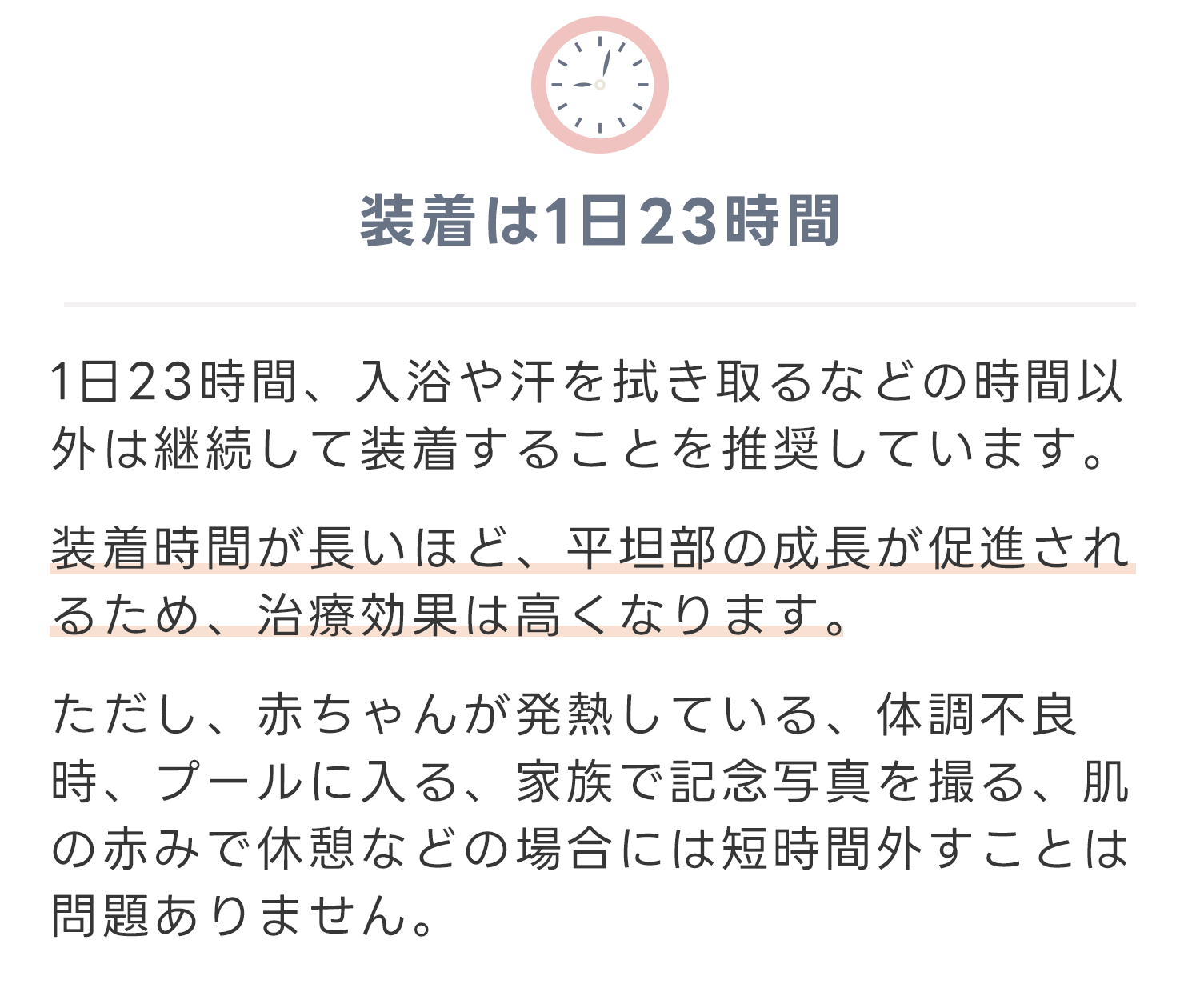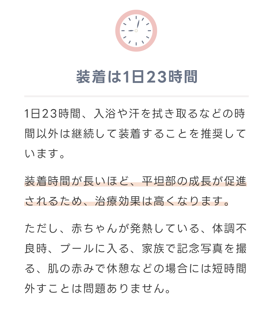 生後3-4ヶ月の頃まではタミータイムや反対側へ向かせる体位変換などで改善することもありますが、それ以降の月齢ではご自宅での工夫でも改善があまり期待できなくなるため、ヘルメット治療が選択肢となります。