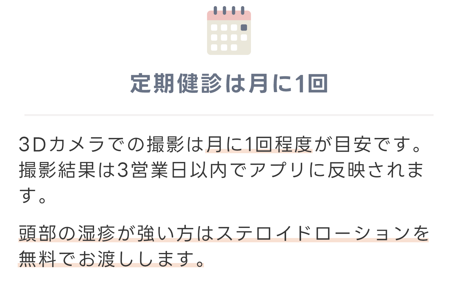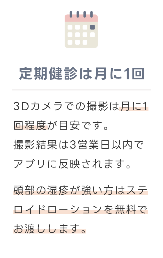 治療開始後は、約1ヶ月毎にクリニックに通院(または訪問)し、3Dカメラで撮影し、頭のゆがみの改善度を確認します。その撮影結果は、いつでもスマホのアプリで閲覧することができます。