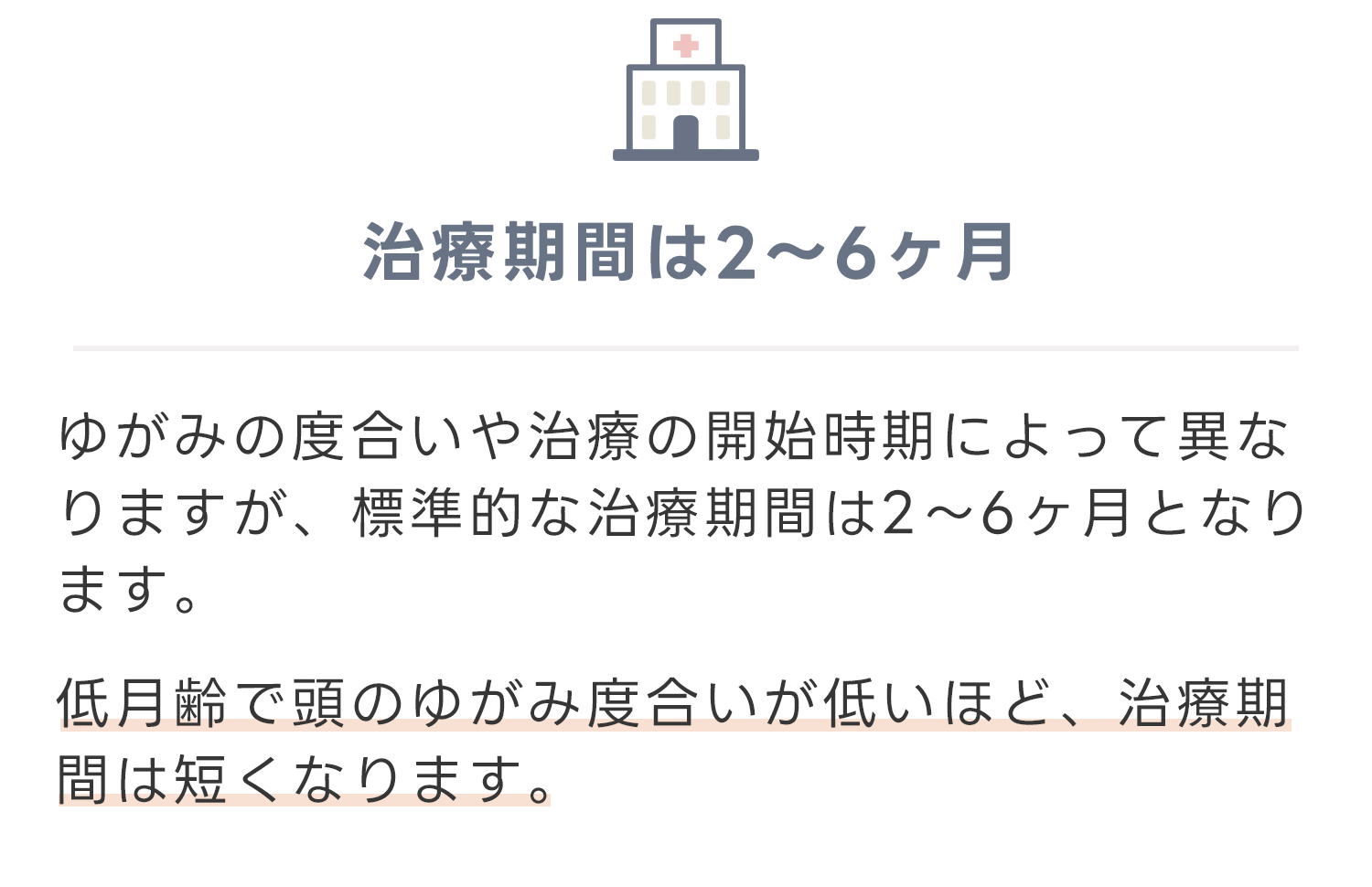 治療は生後3~5ヶ月頃で開始し、治療期間は3~6ヶ月程度(平均4ヶ月程度)要します。